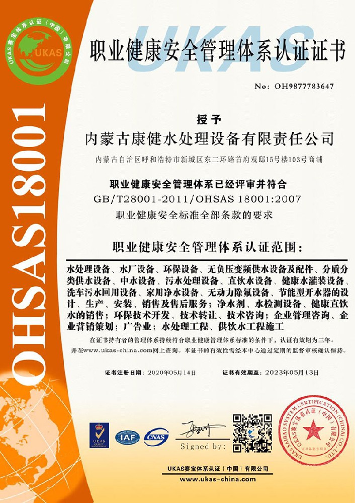 職業(yè)健康安全管理體系認證證書